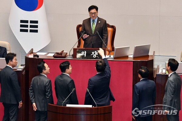 [시사포커스 / 오훈 기자] 24일 서울 여의도 국회 본청에서 열린 제242회 국회(임시회) 본회의에서 한덕수 대통령 권한대행 국무총리의 추가경정예산안 시정연설이 끝난 뒤 우원식 국회의장의 발언이 있자 권성동 국민의힘 원내대표와 일부 의원들이 항의하고 있다.