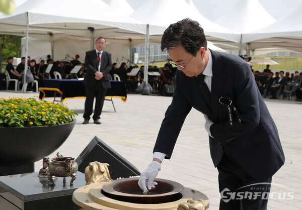 추념식이 시작된 오전 10시에 추모의 의미를 담은 사이렌이 울리자 참석자들의 묵념과 함께 조총 21발이 발사됐다.