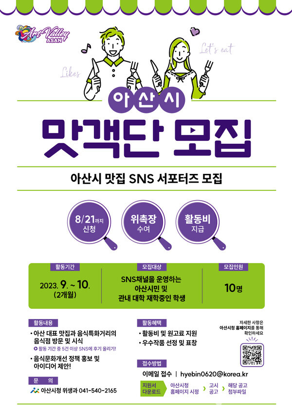 신청 자격은 블로그, 인스타그램, 유튜브 등 SNS 채널을 운영하는 아산 시민 및 아산시에 있는 대학교 재학생이며 활동 기간은 9월부터 10월까지 2개월이다.