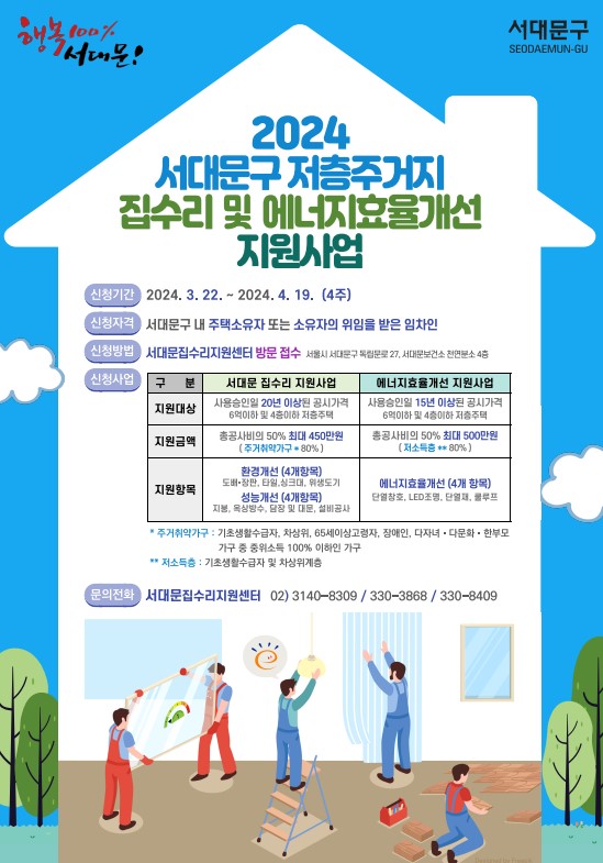 자세한 내용은 서대문구청 홈페이지 고시공고를 확인하거나 서대문집수리지원센터(02-3140-8309, 330-3868, 8409)로 문의하면 된다.